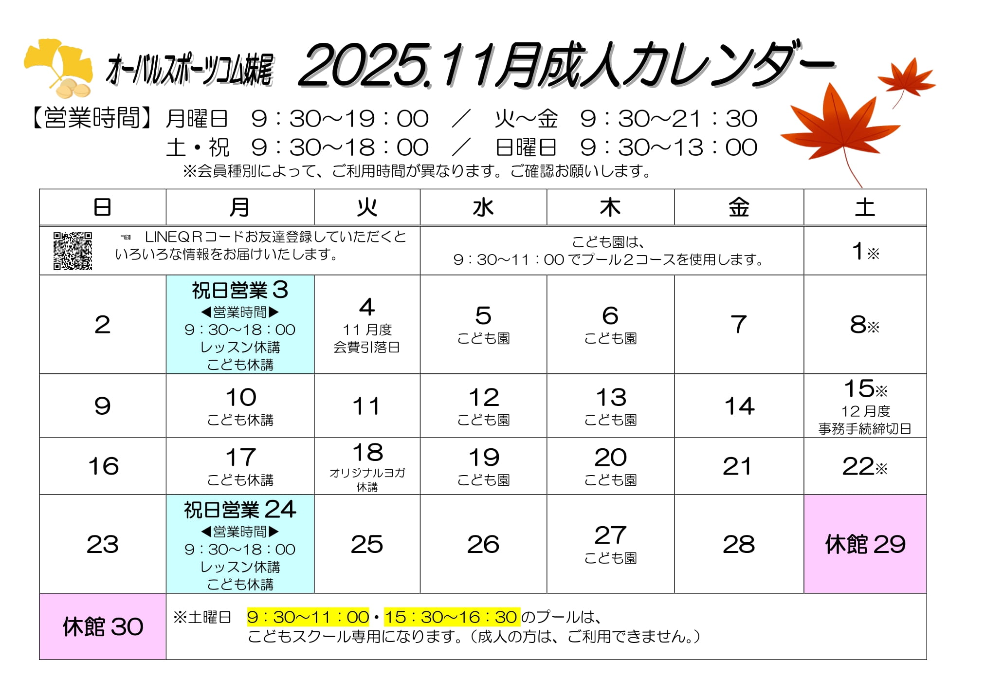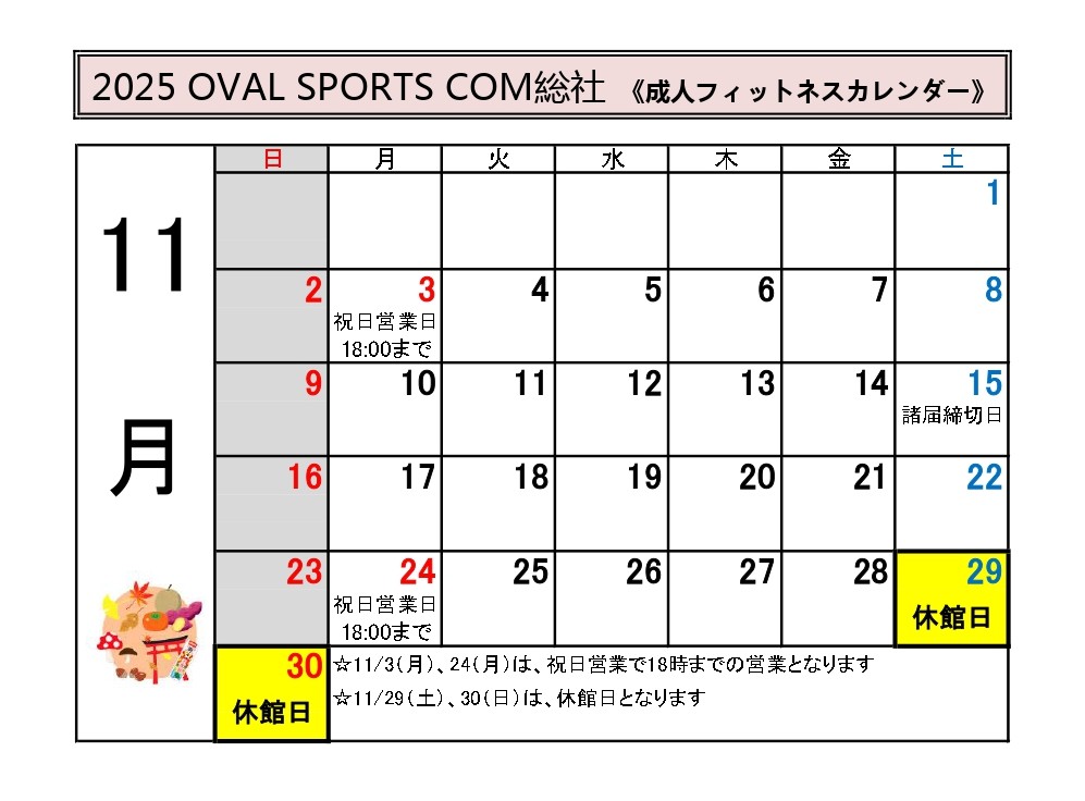 | 祝日営業日 | 11月3日(月)・24日(月) ◆営業時間 9:30~18:30 ※レッスンは休講です。 |