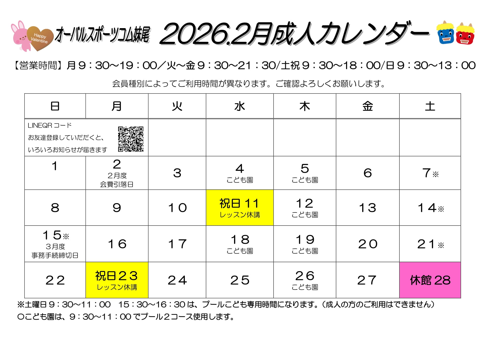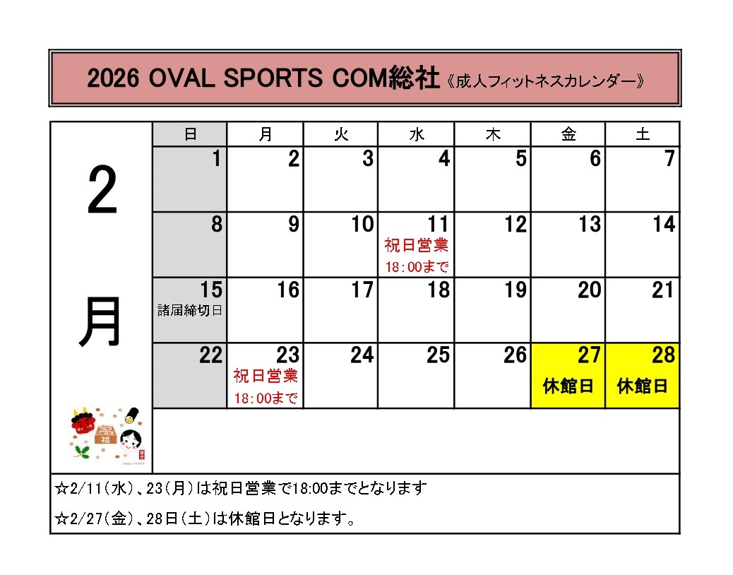 | 祝日営業 | 2月11日(水)・23日(月) 営業時間 9:30~18:30 ※レッスンはお休みです。 |