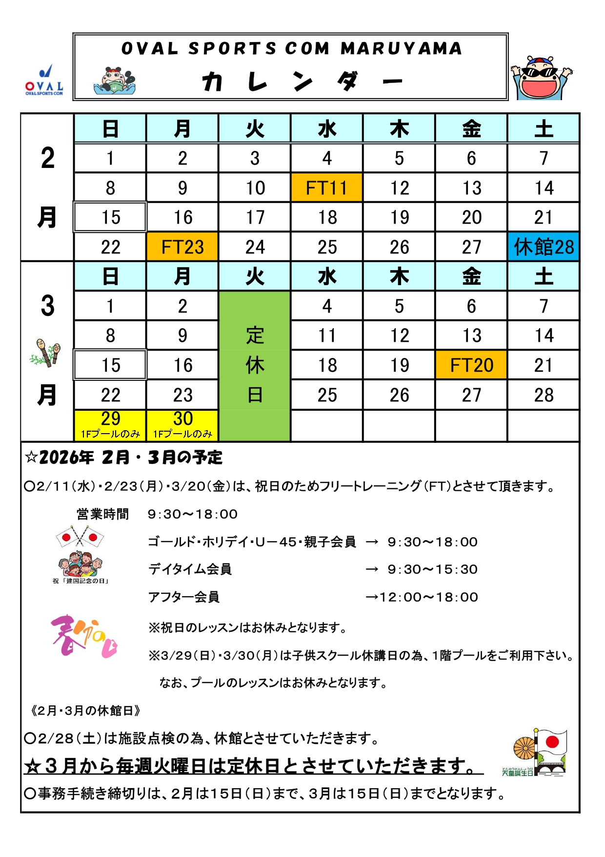 | 祝日営業 | 2月11日(水)・23日(月) 営業時間 9:30~18:00 ※レッスンはお休みです。 |